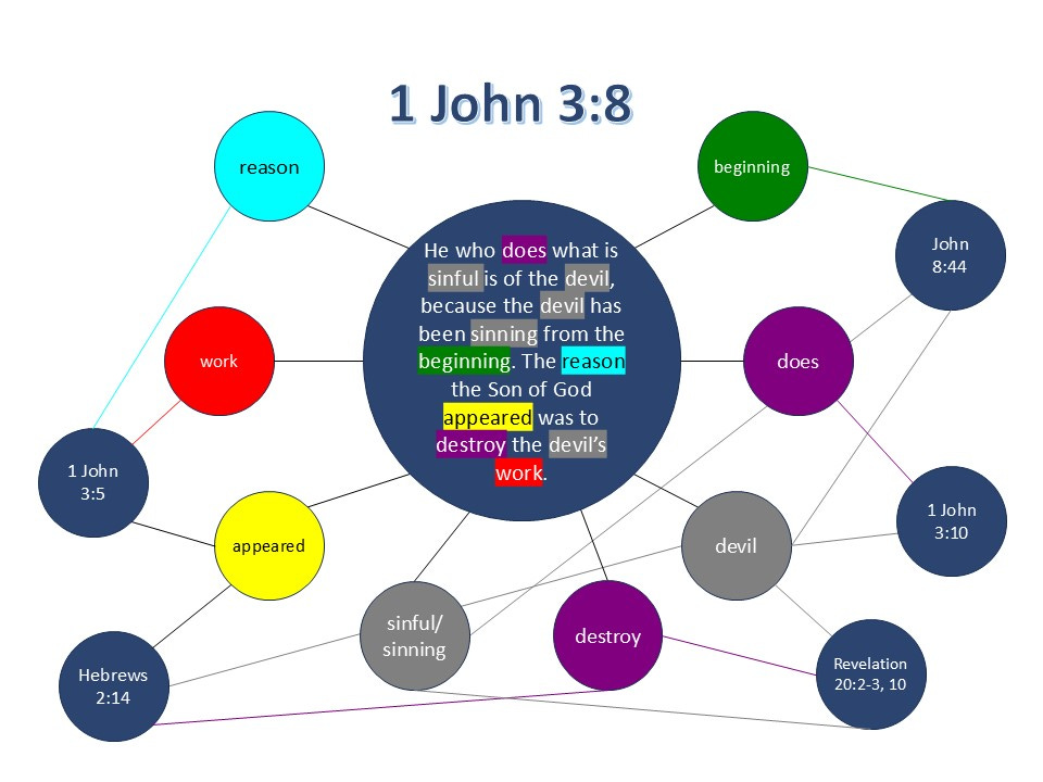 Here is an image of my verse map for 1 John 3:8. I will also type out what I have written for easier reading.